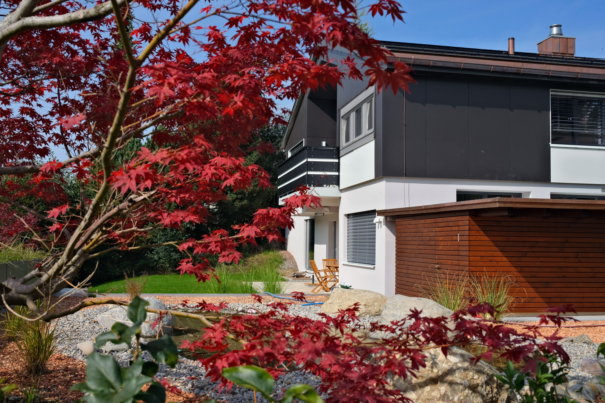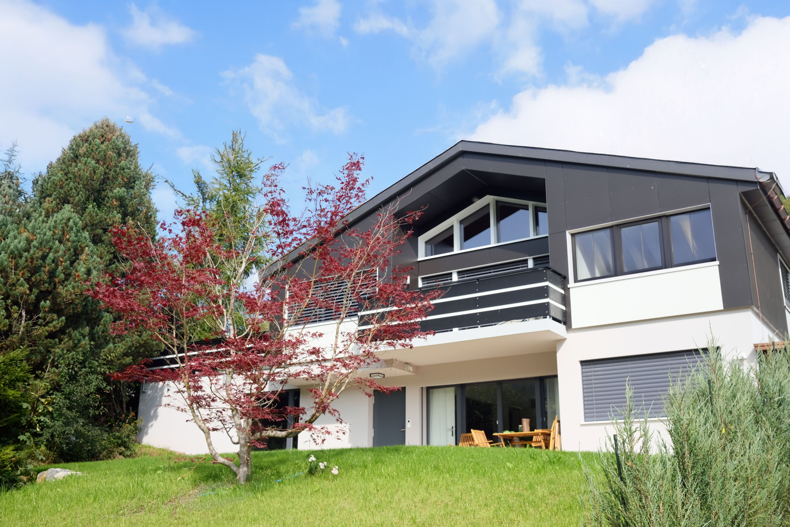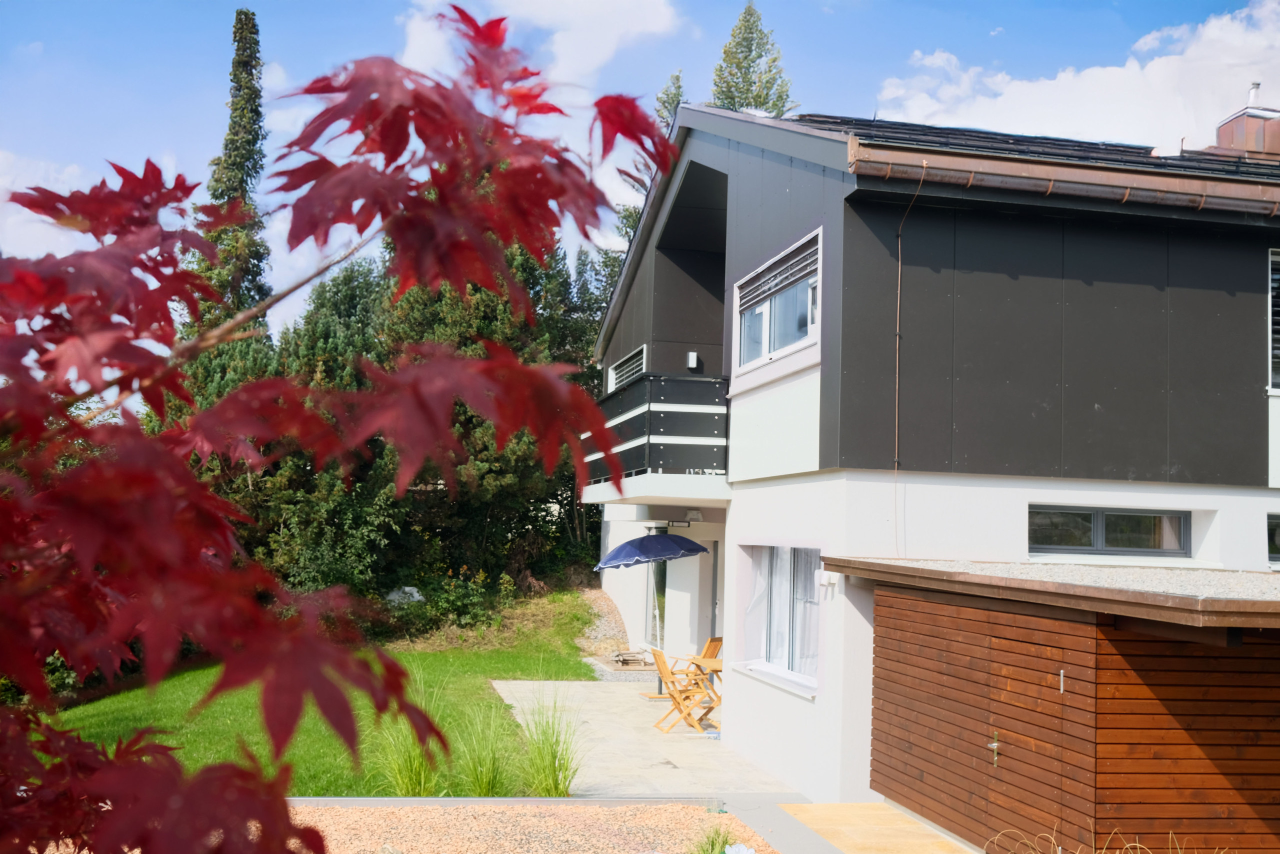 L'appartement dispose d'une surface habitable généreuse et se distingue par une vue magnifique sur les montagnes et le jardin.