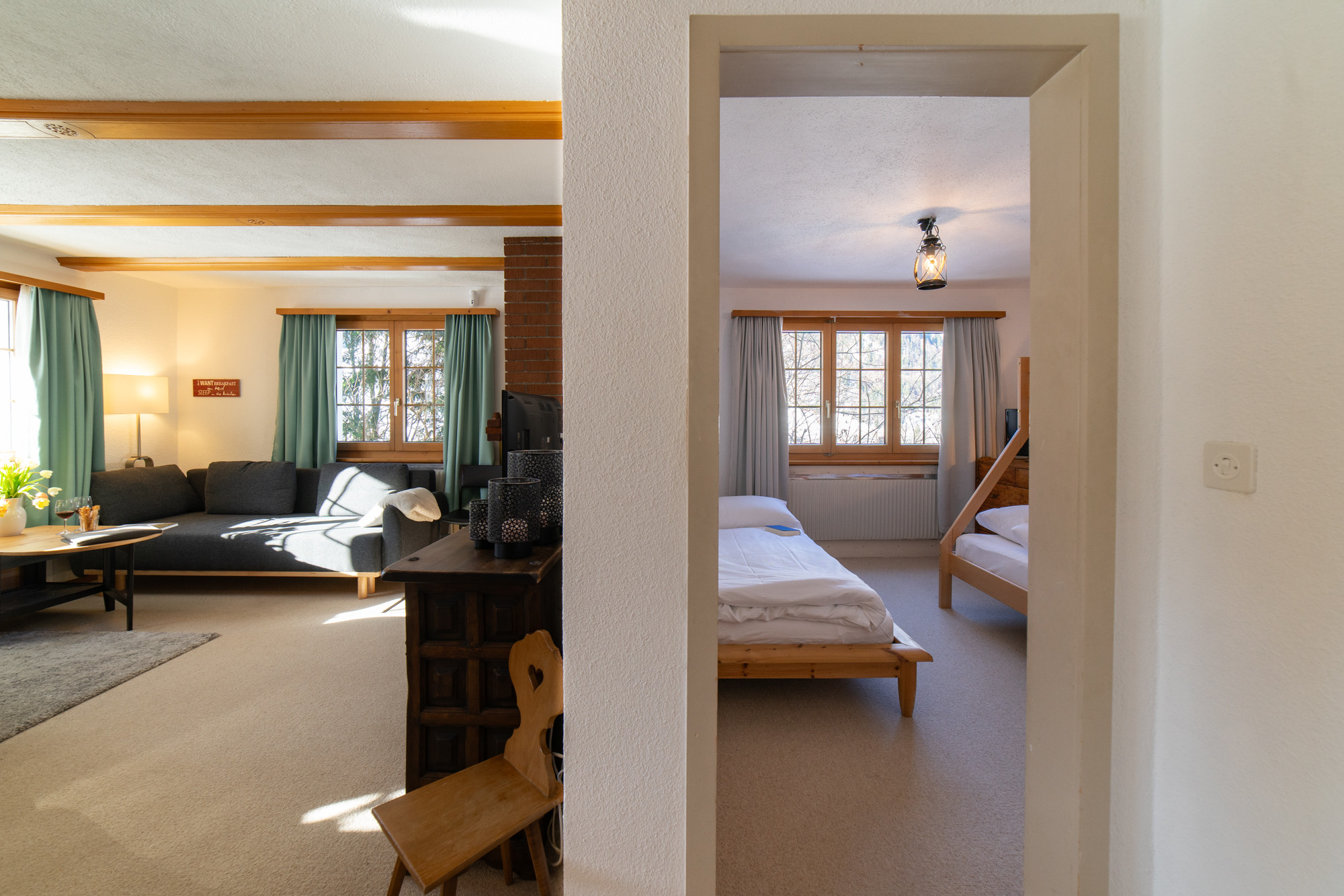 À partir de la sixième personne, la suite fraîchement rénovée de 2,5 pièces au sous-sol sera également ouverte, offrant de la place pour jusqu'à trois autres invités. Elle dispose d'une chambre à coucher avec un lit superposé et un lit simple supplémentaire, une cuisine moderne et neuve ainsi qu'une salle de bain avec douche. Les deux appartements ne sont pas connectés et ont deux entrées séparées.