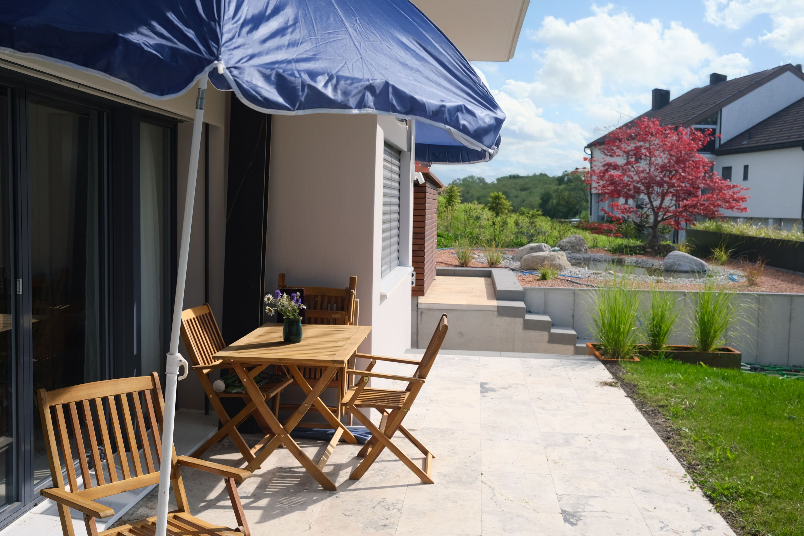 Die Wohnung verfügt über eine grosszügige Wohnfläche und besticht durch einen herrlichen Blick auf die Berge und den Garten.