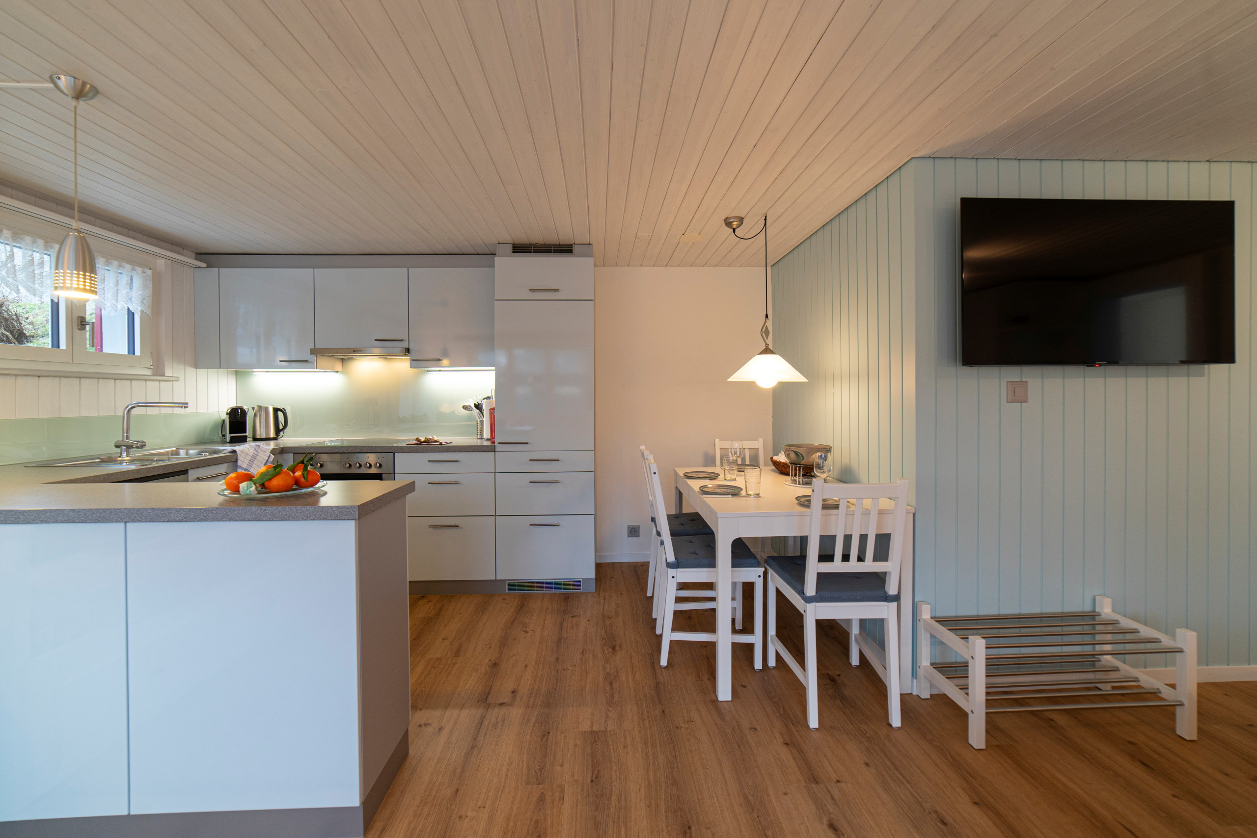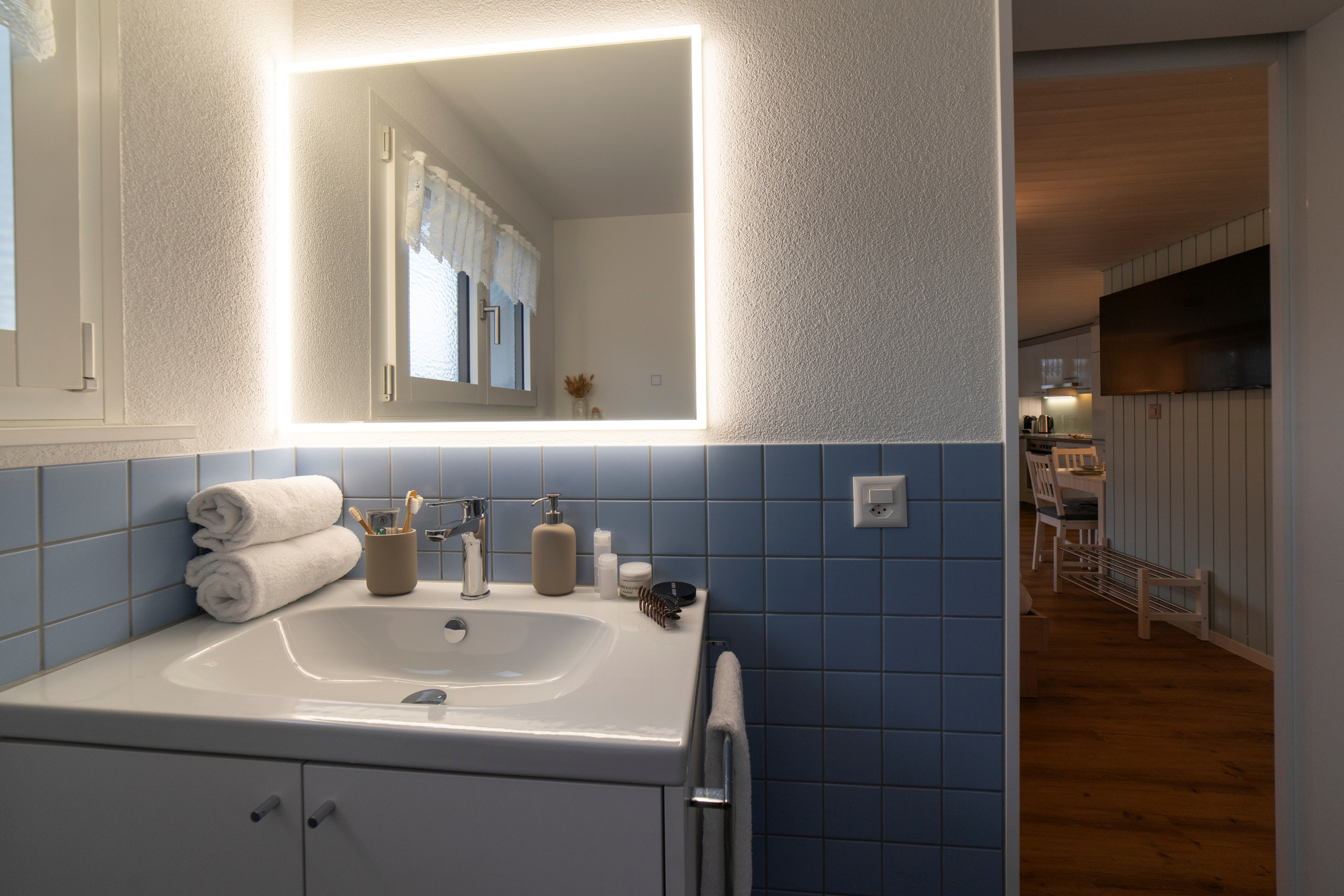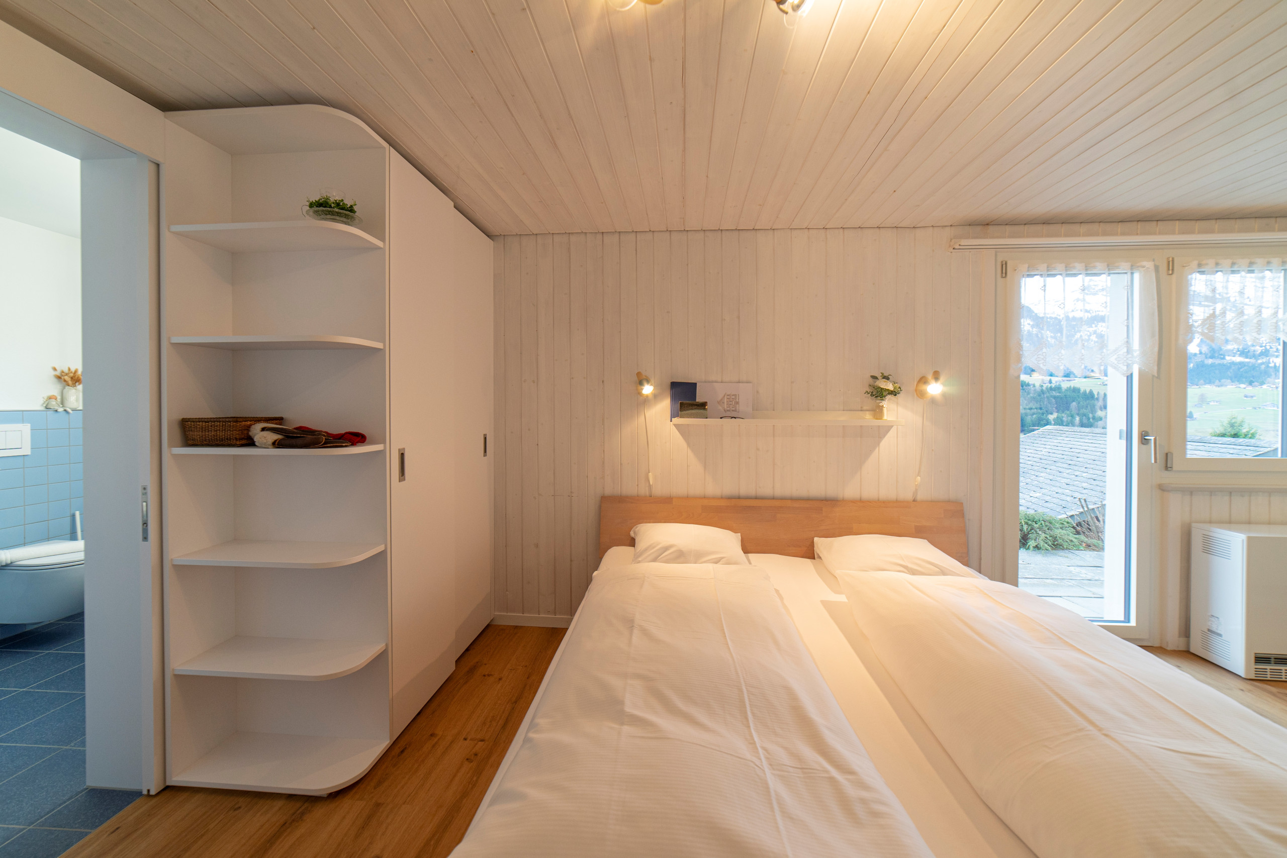 Der Wohn- und Schlafbereich ist mit einem Doppelbett und einem ausziehbaren Bett ausgestattet, das sich tagsüber als Sofa nutzen lässt. Die offene Küche bietet alles für den täglichen Komfort inklusive Raclette- und Fonduegeschirr. Das frisch renovierte Badezimmer und die erneuerten Böden und Wände sorgen für ein helles, gepflegtes Ambiente.